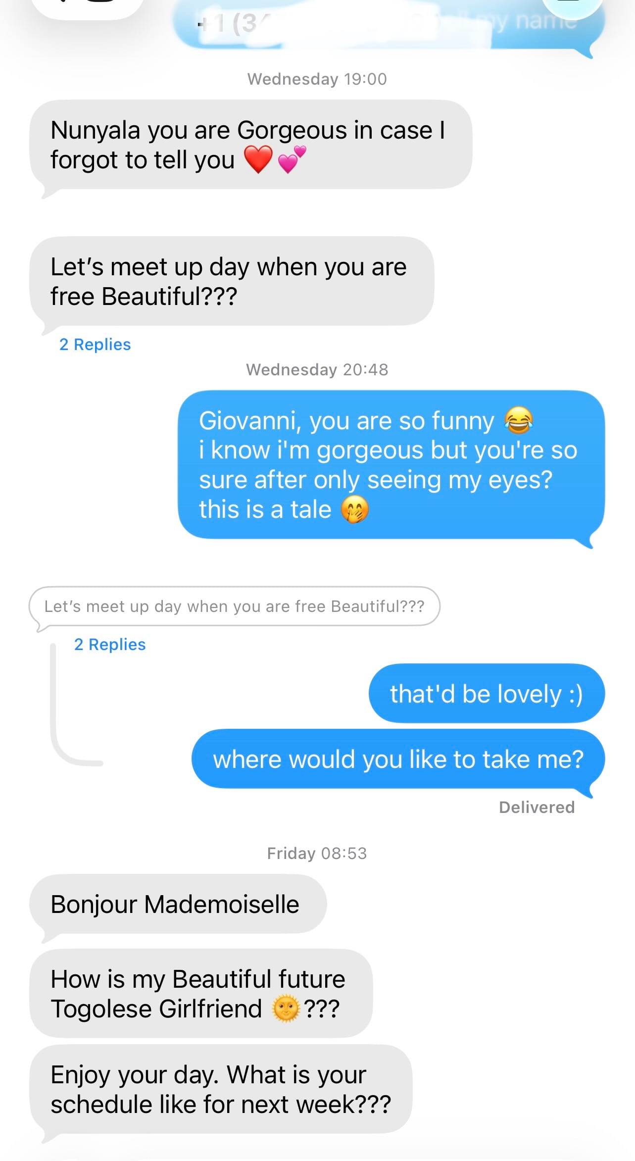 After asking him, āWhere would you like to take me?ā when he said āLetās meet up when you are freeā, the following texts should have been options and "Are you available x date and x time?" But instead he asks me when Iām free, and it wasnāt only the asking when Iām free because to be honest, Iām actually quite unavailable lolol and Iām not making time in my schedule for a stranger who stopped me on the street and is giving me signs that heās a bad planner: